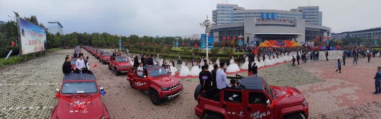 2020年的国庆与中秋“在一起”,82对来自航天系统的新人也在这一天结为伉俪。10月1日,以“让祖国见证幸福”为主题的中国航天人大型主题集体婚礼在北京航天城、酒泉卫星发射中心、中国卫星海上测控部等七地联动,301对在航天事业奋斗的新人共庆祖国华诞、同圆人生大典。在北京航天城举办的集体婚礼上,承担主婚车任务的是42辆北京越野BJ40城市猎人版。红色的“方盒子”徐徐驶入会场,阵容强大,气势震撼,火红的车身和洁白的婚纱交相辉映,在特殊的日子里,请祖国见证幸福。