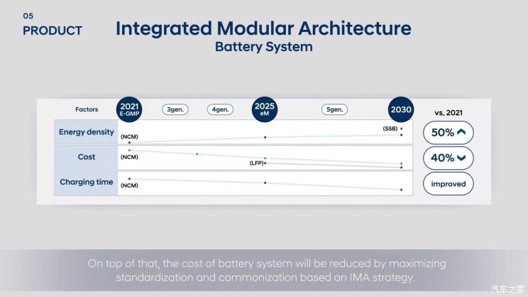 [本站 新能源] 日前,现代汽车宣布将在2025年推出全新的电动车专属架构集成模块化架构(IMA)。IMA架构是从电动全球模块化平台(E-GMP)上升级而来,不仅将车辆底盘进行了标准化,还将为整个产品线提供9种标准化电池组和5种标准化电机,有望覆盖电动乘用车的所有细分市场以及专用车市场(网约车等定制车市场)。