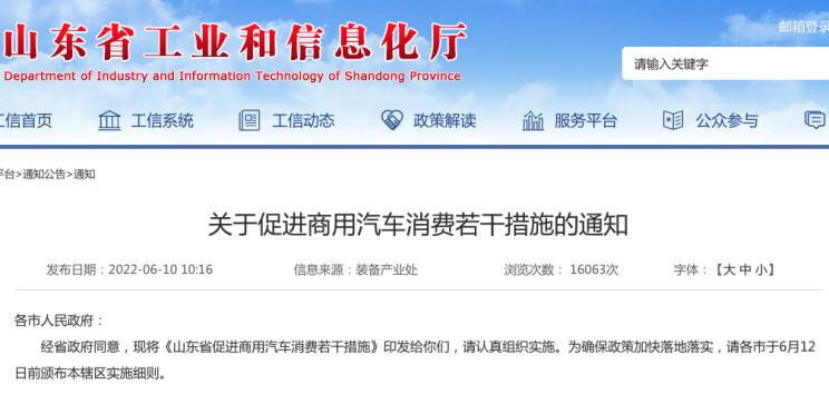 山东省工业和信息化厅、省发展和改革委员会、省财政厅、省商务厅、省统计局五部门联合出台《山东省促进商用汽车消费若干措施》,将在落实国家和省现有汽车消费政策基础上,政府与企业联动,发放1.2亿元消费券开展促进商用汽车消费活动。政策措施有效期截止至2022年6月30日,如延长实施时间另行通知。原文如下: