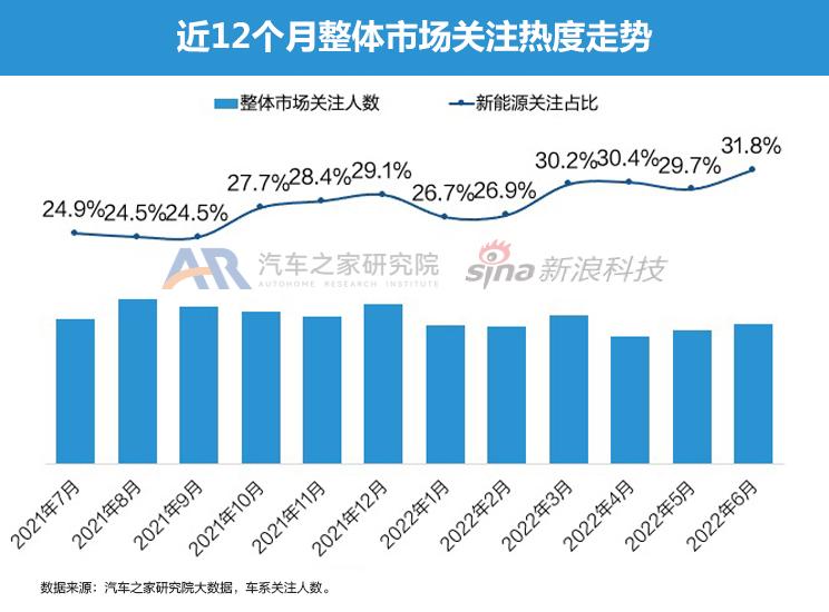 6月新能源市场环比热度持续回暖,其中新能源市场关注占比达到31.8%,位于近12个月最高份额。这与智能汽车市场热度的高涨有着直接关系。6月,智能汽车市场关注占比新能源整体市场高达75.6%。