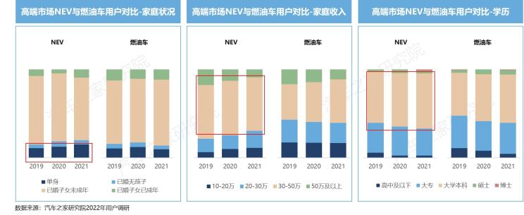 2.高端新能源用户单身更多,家庭收入与受教育水平更高:随着90后用户的增多,高端新能源未婚、单身的用户比例呈现逐年上升趋势。相对于同档次燃油车,高端新能源用户家庭收入与受教育水平更高。