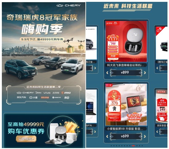 进入品牌联合会场,各类好品一网打尽,参与活动即可免费获得近未来科技生活联盟的科技礼包(美的洗衣机、vivo耳机、小度智能平板、100万京豆……)。11月1日——11月8日,多场跨品连麦直播,奇瑞也将走进联盟小伙伴直播间,好礼无限,精彩不停歇。更有嗨购直播盛典,至高49999元大额购车优惠券、互动有礼、百万京豆、秒手机、平板及万元笔记本……多重聚惠只等你来。