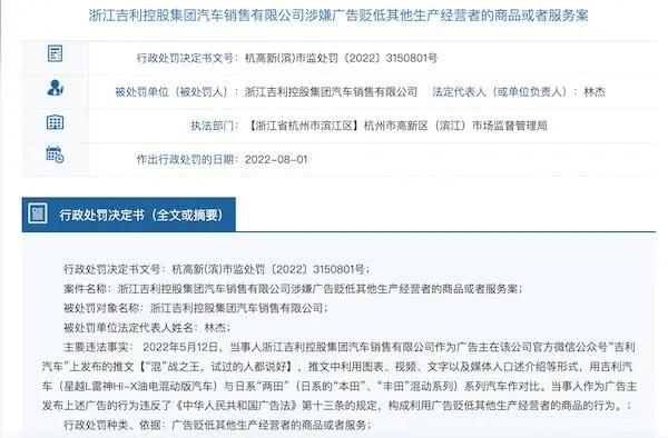 早在2022年5月12日,吉利销售公司作为广告主在公司官方微信公众号“吉利汽车”上发布的推文“‘混’战之王,试过的人都说好”,推文中利用图表、视频、文字以及媒体人口述介绍等形式,将吉利汽车(星越L雷神Hi-X油电混动版汽车)与日系本田、丰田的混动系列汽车作对比。对此,杭州市高新区(滨江)市场监督管理局认为,吉利销售公司构成利用广告贬低其他生产经营者的商品的行为,责令其停止发布广告并罚款1万元。