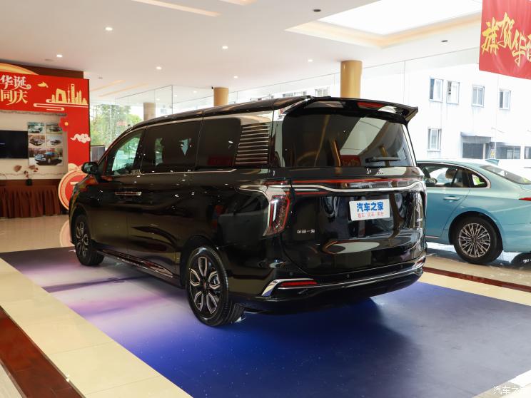 车身侧面为多腰线设计,侧滑门使用了隐藏式轨道,与后车窗部分的横向镀铬饰条相得益彰,再加上悬浮式车顶,整体视觉效果非常不错。另外值得一提的是,设计师还颇有心思在D柱上方的饰条上留下了“HQ9”字样。