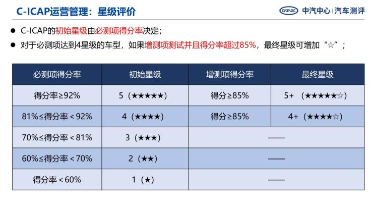 另外,C-ICAP《中国智能网联汽车技术规程》将由中汽中心汽车测评管理中心运营,进行“统一买车、统一买车、统一评价、统一公布”。该规程将采取星级评价方式,根据必测项和增测项得分率,确定被测车型星级。