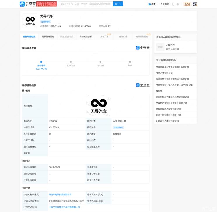 通过企查查官网查询到,魅族科技在此前申请注册“无界汽车”商标,国际分类均为运输工具,当前商标状态为申请中。根据申请信息,无界汽车选用了类似“莫比乌斯带”作为标识。
