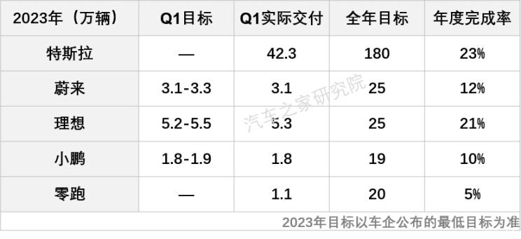 但结合年度销量目标来看,特斯拉2023年设定交付目标180-200万辆,同比增长37%-50%,目标增速放缓。除小鹏外,“蔚小零”2023年销量目标冲击20万辆,各家完成压力较大。理想Q1交付5.3万辆,同比增长66%,目标完成率21%,位列第二。蔚来Q1交付3.1万辆,目标完成率12%,同比4%跑输市场;小鹏、零跑是唯二Q1交付同比下滑的车企,表现不佳。