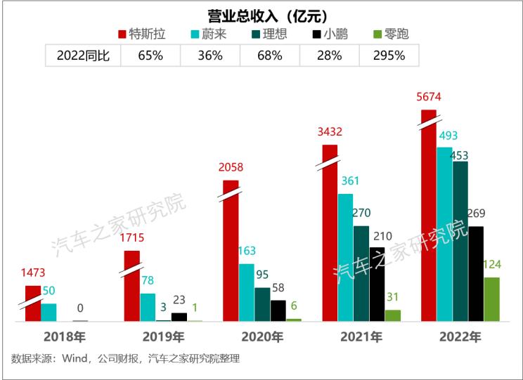 特斯拉总体营收规模体量最大,同比增长65%。蔚来、理想单车均价都超30万,营收也都在2022年首次突破400亿。小鹏汽车受单车均价的制约,即使交付量与蔚来相差不大,但营收仅为269亿。零跑增长最快,营收增长近3倍,但其核心销售车型仍是10万元以内的微型车T03,因而营收也仅125亿。