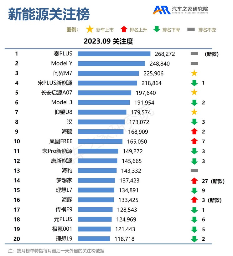 9月,新能源市场关注榜前三的车型分别为:比亚迪秦PLUS、特斯拉Model Y、问界M7