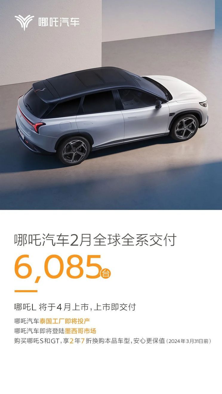哪吒汽车2月全球全系交付6085台。同时,定位为中型SUV的哪吒L将在4月完成上市,并开启交付。此外,哪吒汽车泰国工厂即将投产,并且该品牌即将登录墨西哥市场。值得一提的是,即日起至3月31日购买哪吒S和哪吒GT可享2年7折换购本品车型。哪吒L基于山海平台打造,提供纯电版和增程版两种动力选择。根据工信部申报信息,哪吒L将提供纯电版和增程版两种动力选择。其中增程版搭载由赛力斯旗下重庆小康动力开发的1.5升四缸自然吸气增程器,发动机最大功率91马力(67kW),配备来自蜂巢能源的磷酸铁锂电池。纯电版车型电机最大功率为170kW,同样采用蜂巢能源的磷酸铁锂电池。并且据此前消息,哪吒L还将提供宁德时代长寿命L系列神行动力电池可供选择。