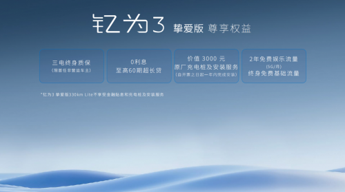 更大的空间获得、更好的续航保障、更懂用户的细节设计,是钇为3挚爱版为用户带来愉悦体验的三大核心。得益于“短悬长轴”的设计,以及零部件的高集成,钇为3挚爱版“轴长比”达到0.651,“得房率”同级第一,让4米级的灵活车身也能拥有A+级车的驾乘空间;505km的同级最高续航,搭载高能效热泵空调,荣获中汽中心2024年冬测“高寒续航之星”称号;同级唯一的后排独立出风口、同级唯一的冷暖手扶箱,还有超大的柔光化妆镜、无线充电、加热/通风电动主驾等贴心配置,钇为3挚爱版可谓“卷”到用户心坎去了。