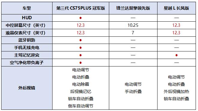 横向对比一下三款车型的科技舒适配置可以看到,第三代CS75PLUS冠军版搭载了HUD、手机无线充电、空气净化带负离子等功能,外后视镜支持电动除霜、位置记忆、倒车自动调节。这些都能大大提升日常出行体验,如负离子的空气净化功能能及时净化车内空气,让车内空间随时保持清新,防止车内乘客晕车,而这些配置在锋兰达双擎领先版和星越L长风版上都是空白。