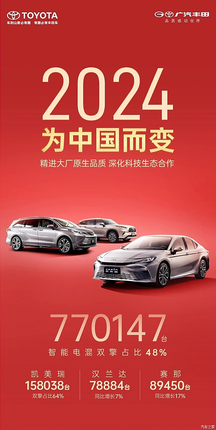广汽丰田2024年销量770147台,智能电混双擎占比48%。凯美瑞销量158038台,双擎占比64%。汉兰达销量78884台,同比增长7%。赛那销量89450台,同比增长17%。