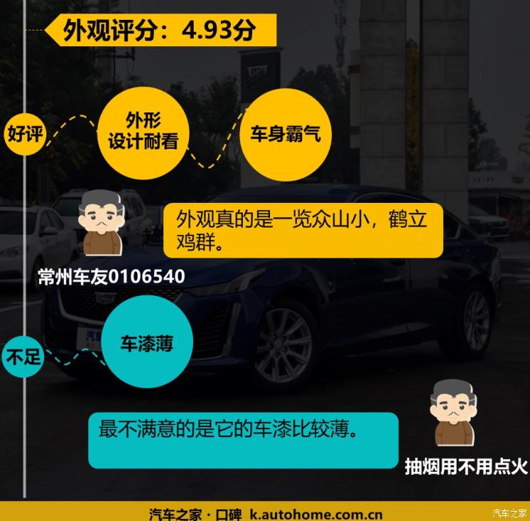 从得分情况来看,凯迪拉克CT5的外观评分达到4.93分,可见消费者对其外观十分满意,对于凯迪拉克标志性的泪型大灯赞美颇多。常州车友0106540称,“外观真的是一览众山小,鹤立鸡群”。车主没有那么南表示,“外观设计前卫,年轻时尚的大灯很好看,尾灯多么引人注意”。西安车友6636253发表口碑称,“车灯的泪痕设计是我最喜欢的”。