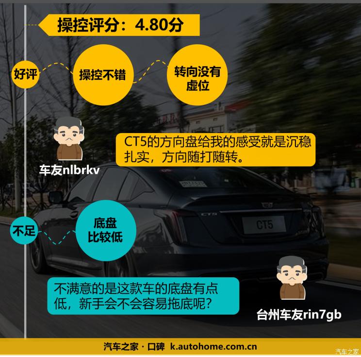 在操控方面,车主们普遍表示满意,纷纷称赞CT5操控不错、转向没有虚位/稳定性好、方向盘轻重合适等。车主之家车友nlbrkv认为,“CT5的方向盘给我的感受就是沉稳扎实,方向随打随转”。宜昌车友4107569表述的十分精炼,“跑得快,刹得住”。