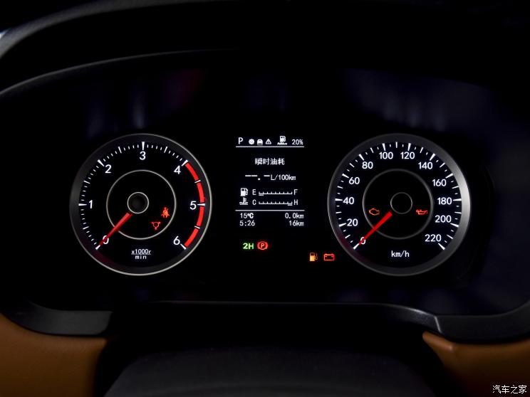 新车内饰部分采用了双色设计,平直的线条与整车的硬朗风格相称。方向盘部分配有换挡拨片,方便驾驶员针对不同路况进行升降挡操作。仪表盘为双圆形设计,黑底白字的显示效果清晰明了。