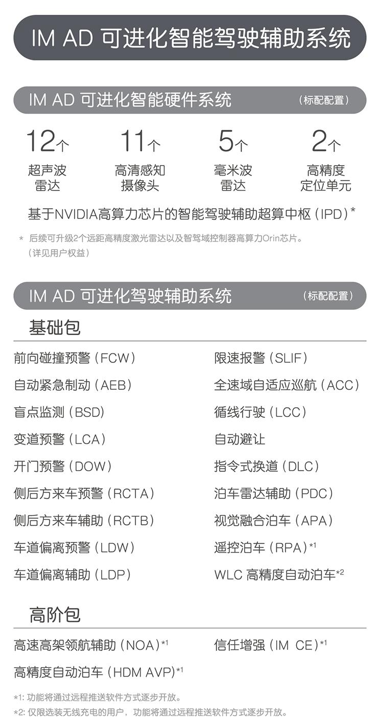 在这套硬件的加持下,新车具备前向碰撞预警、限速报警、自动紧急制动、全速域自适应巡航、盲点监测、循线行驶、编导预警、自动避让、开门预警、侧方预警、车道偏离预警等功能;而遥控泊车、高速高架领航辅助、高精度自动泊车等未来需要通过OTA逐步开放,这样的配置升级方式在电动车市场似乎将会成为一种主流趋势。