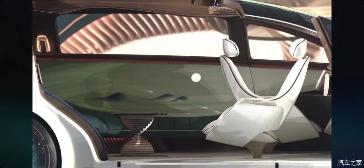 打开车门,车内采用了云山珠水织物面板设计理念,据悉这一理念未来将应用到广汽的更多车型之上,车辆内部,仅展现了两个概念化的座椅,以及围坐式沙发和茶几,整个线条如同流觞曲水,重山浮云,展现出中国意境之美,和中国的茶文化。