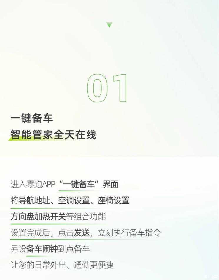 导航规划目的地地址,通过零跑APP进行位置选择,即可发至车机;备车重复频次,可选择周一至周日;一键备车生效持续时间为20分钟。