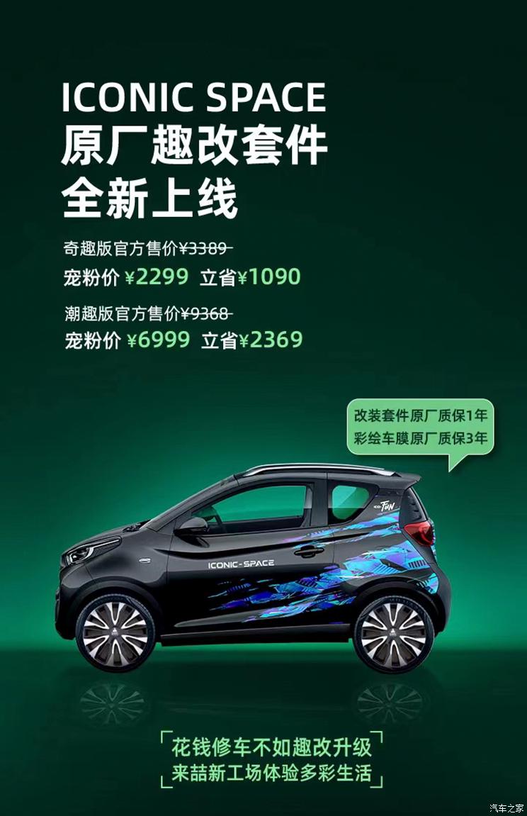 [本站 资讯]日前,奇瑞新能源ICONIC SPACE原厂趣改套件全新上线并公布价格。奇趣版官方售价3389元,宠粉价2299元,潮趣版官方售价9368元,宠粉价6999元。改装套件原厂质保1年,彩绘车膜原厂质保3年。2月20日起,车主可以通过“�葱鹿こ「淖�Club”小程序购买两个版本的改装配置套件,对自己的爱车的外观、内饰和个性配件进行定制升级。