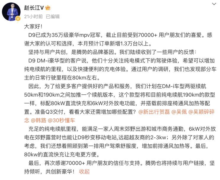 [本站 资讯]近日,腾势销售事业部总经理赵长江在社交媒体上表示:“通过用户的调研,我们也发现部分车主的日常行驶里程在80km左右。因此,为了给更多客户提供好的产品和服务,我们计划在DM-i车型两驱续航50km和190km之间加推一个续航版本,准备Q3交付。”