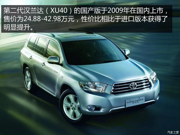 代号为XU40的第二代汉兰达于2007年芝加哥车展首发,这款车整车尺寸更大,得益于升级的座椅,新车的车内空间可以进行灵活组合。2007年7月,这款车以整车进口的形式引入。在2009年,这一代产品正式国产上市,共推出3.5L和2.7L两个排量共10款车型。从2009年上市至2014年底,国产汉兰达累计销量已达到46.58万辆。