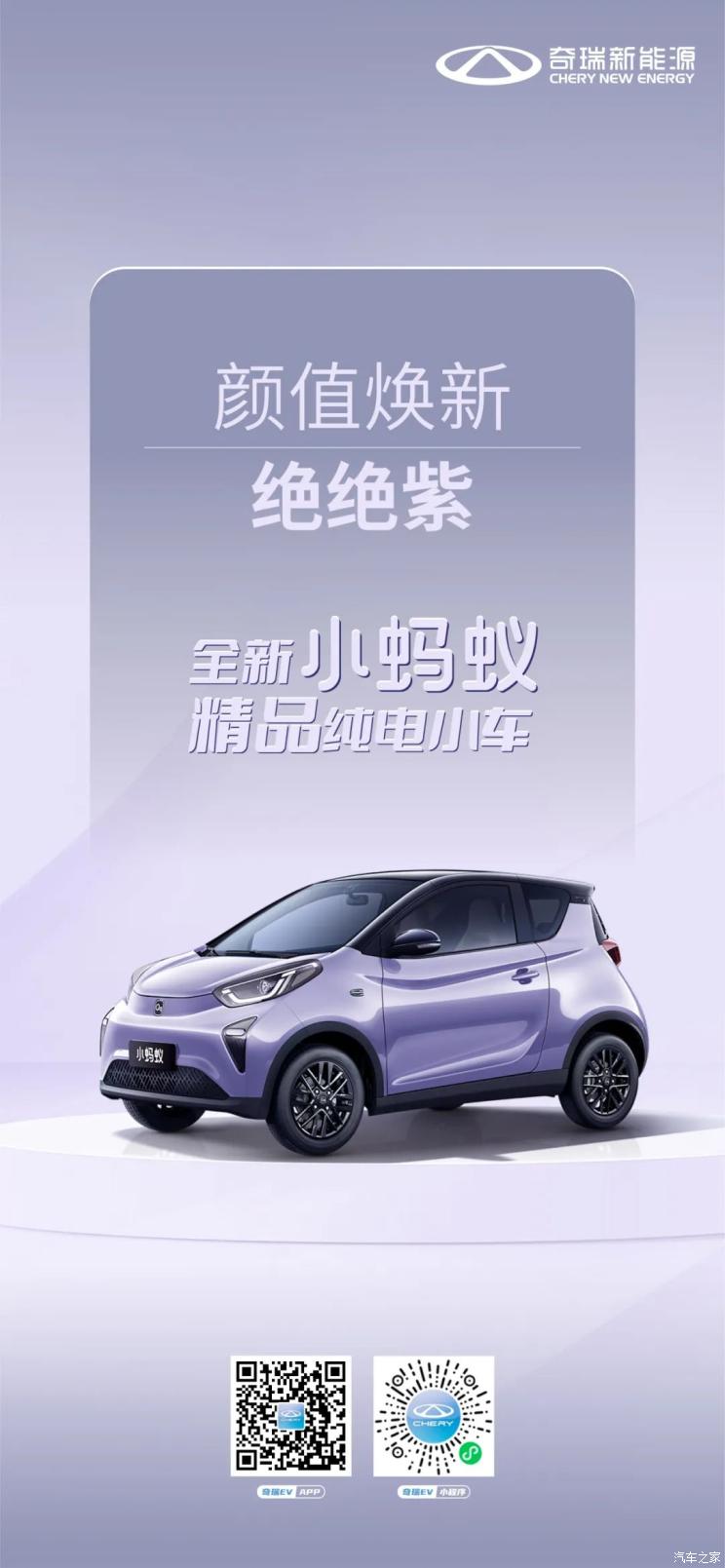 [本站 新车官图] 奇瑞新能源宣布,小蚂蚁上新两款车色,分别为“不焦绿”和“绝绝紫”。同时,新车的外观细节也发生了变化,并将于近期上市。
