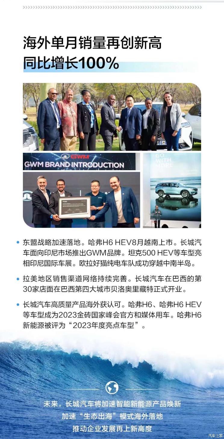 [本站 资讯] 9月6日,长城汽车股份有限公司(股票代码601633.SH、02333.HK、82333.HK;以下简称“长城汽车”)发布2023年8月产销数据。今年8月,长城汽车销售新车114,096辆,同比增长29.32%,五大品牌全线飘红,企业发展势头持续向好;新能源车型销售26,301辆,同比增长119.83%;海外销售30,741辆,同比增长99.95%,单月销量创历史新高。