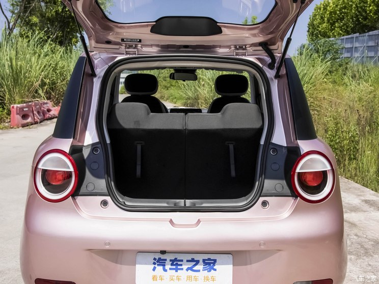 车身侧面,圆润的车身造型营造出憨萌的视觉效果,与五菱宏光MINIEV相比,展现出另一种可爱的风格。新车采用隐藏式门把手以及低风阻轮圈,其轮圈造型也十分可爱,轮胎规格为165/70 R14,车辆后排的车窗有不错的视野。车身尺寸方面,新车长宽高分别为3270/1700/1545mm,轴距为1980mm。新车尾部同样比较简洁,尾灯设计与前大灯形成呼应,尾部车窗视野良好,后尾门的开启后,后备厢储物空间在同级来说表现还算不错。