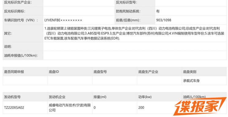 车身尺寸方面,其长宽高分别为5206/2024/1859mm,轴距为3205mm,定位为中大型MPV。其他方面,该车会提供255/50 R19和265/45 R20两种轮胎规格,此前申报车型为六座版本。动力方面,该车将搭载一台型号为TZ220XSA02驱动电机,最大功率为200千瓦。电池方面,未来将配备三元锂电池组。关于新车更多信息,我们也将持续关注。