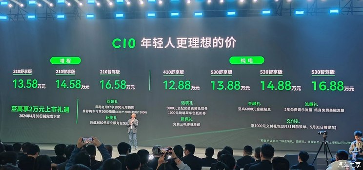 [本站 新车上市] 3月2日,零跑C10正式上市,共推出7款车型,售价区间为12.88-16.88万元。零跑C10是基于全新LEAP3.0架构打造的首款车型,定位中型SUV,有纯电版和增程版可选,增程版搭载95马力1.5L四缸增程发动机,CLTC纯电续航里程210km,电机最大功率231马力。纯电版电机最大功率231马力,CLTC续航530km。配置方面,新车搭载高通骁龙8295芯片、激光雷达和多项驾驶辅助配置。据悉,该车三季度将在海外上市。