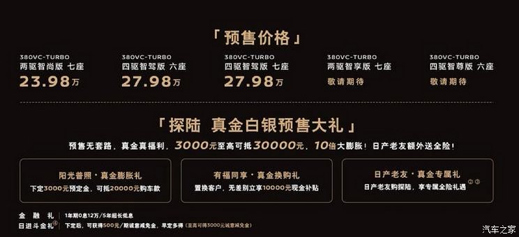 [本站 资讯] 东风日产旗下全新SUV探陆将于3月6日正式上市,该车正处预售状态,其中三款车型的预售价23.98-27.98万元,还将会有更高配置车型补充,新车提供六座、七座可选,定位中大型SUV。该车在海外已经历经四代,此次国产版为第五代车型,更契合中国“大家庭”的用车需求。
