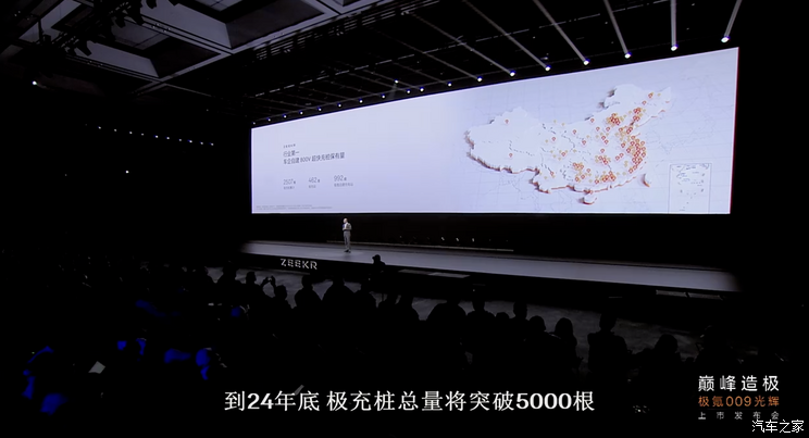 针对充电方面,从10%-80%充电时长为11.5分钟。此次极氪发布极充V3充电桩,单枪峰值功率达到800kW,最大输出电压1000V,最大输出电流800A。按照规划,到2024年底,极充桩总量将突破5000根,另外极氪还推出1515便利电,即实现15分钟找桩,15分钟充好电。