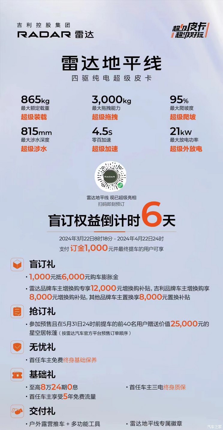 [本站 资讯] 4月23日,我们从官方了解到,雷达汽车旗下皮卡――雷达地平线将于今日上市。新车已于此前开启盲订(官方并未公布具体价格)。