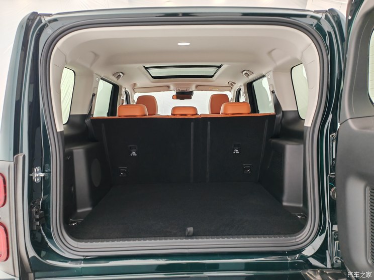 车身侧面,车身腰线贯穿整个车身,线条凹凸有致,展现出硬派越野独有的力量感。城垛式的大轮拱设计,与车身硬派造型相呼应,彰显硬派越野车的特质。尾部方面,新车是一副标准的硬派越野车模样,外挂备胎+纵向分布的尾灯组均没有缺席。当然,后备厢门也延续侧开式设计。此外,汽油版车型可选17/18/19英寸轮圈,而柴油版车型则仅配备18英寸轮圈。车身尺寸方面,新车的长宽高分别为5070/1960、1976/1930mm,轴距为2850mm。