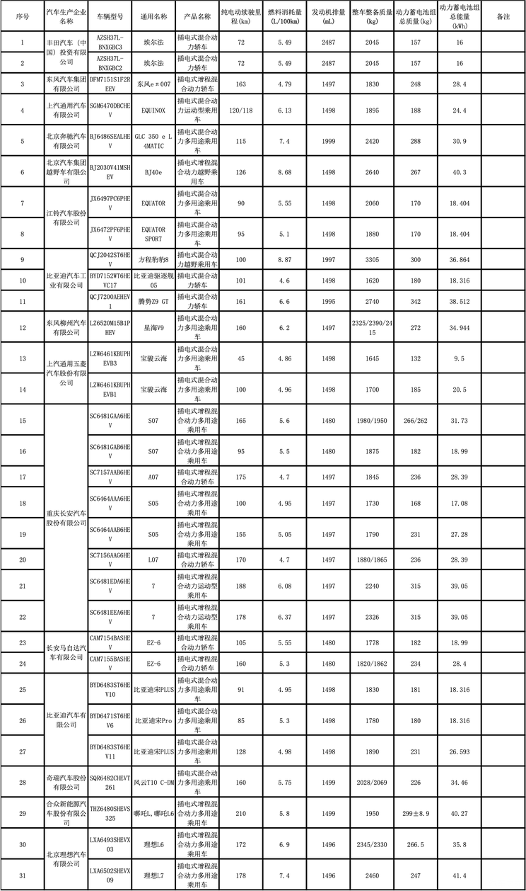 插电混动车型方面,丰田埃尔法插电混动版进入目录当中,其纯电续航72km;奔驰GLC 350 eL 4MATIC纯电续航115km;方程豹豹8纯电续航100km;深蓝S05纯电续航分别为100km和155km;马自达EZ-6纯电续航分别为105和160km。