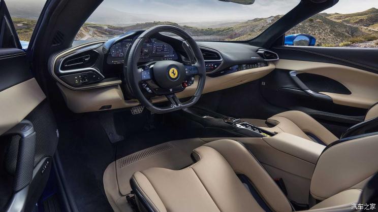 内饰部分,全液晶仪表盘依旧是法拉利进入新时代后的革新配备之一,可以显示更多的行车信息,诸如导航、车辆状态等功能可以更好地展示在驾驶员眼前,增添了日常驾驶的便利性。新车内部也采用了大量的碳纤维与皮质材料,进一步增强运动感与豪华感。