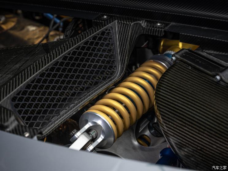 车尾部分,映入眼帘的是一块超大尺寸的后扰流板,配合巨大的中置排气口以及黑色网状碳纤维部件,会给后者带来巨大的压迫感。当然,我们中的绝大不配可能没有机会跟在这辆车的后面。在车身底部,我们还可以看到巨大的后扩散器。