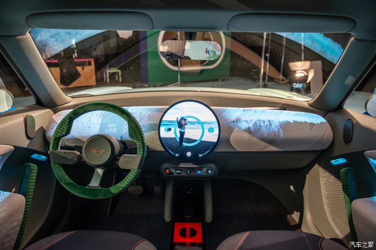 内饰部分,新车采用了较为抽象的中控台设计,整个中控台看上去都变成了一个巨型幕布,中控中央搭配了一个圆形的超薄液晶屏,方向盘则采用了三辐式的设计,整个内饰的样式都是使用的极简主义风格。另外,新车大量采用再利用材料,材质无铬无皮革,展示MINI“迷你至简”的理念,MINI设计新时代由此开启。