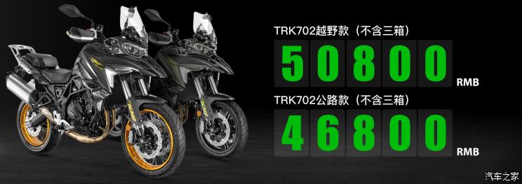 [本站 资讯] 日前我们获悉,贝纳利 TRK702车型迎来了正式上市,新车推出两种版本,分别为公路款和越野款,其中,越野款的售价为5.08万元,公路款的售价则为4.68万元。