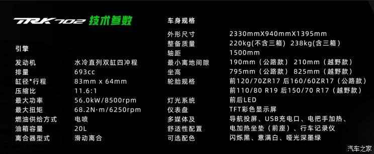 车身尺寸方面,新车的长宽高分别为2330/940/1395mm,轴距1500mm,公路款的座高为795mm,越野款的座高则为82.5mm。配置层面,新车将会配备TFT彩色显示屏,导航投屏、USB充电口、电把手加热、电加热坐垫(前座)、行车记录仪等,并可选择三种不同的车身配色。此外,越野款车型将会配备前110/80 R19,后150/70 R17轮胎,更好地满足用户的越野需求。