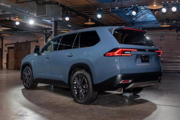 车身侧面来看,新车在视觉感受上更大,整车侧面非常平整,没有采用过多的线条刻画其力量感,但宽厚的前后侧翼子板搭配黑色的轮眉,再加上大尺寸的五辐式轮圈,使得新车的气场更加强大。值得一提的是,新车尺寸相比汉兰达要大上一圈,但轴距未变,主要增加的尺寸在车身后半部分C柱与D柱之间,它比普通汉兰达长6英寸(152.4mm),宽2英寸(50.8mm),高2英寸(50.8mm)。