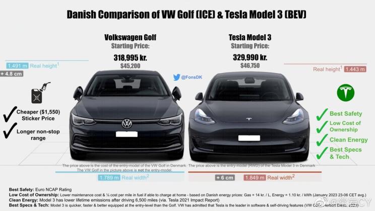 比较有意思的是,媒体将大众高尔夫在丹麦的售价与特斯拉Model 3进行了对比,高尔夫售价为318995克朗(约合人民币31.47万元),特斯拉Model 3标准续航版售价为329990克朗(约合人民币32.54万元),两款车型价格已经十分接近,这引发了当地人的讨论。