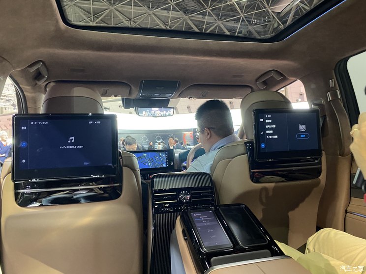 后排车门提供普通打开和侧滑门两种开门方式,普通打开的后排车门可以75度开启。后排采用两个独立的座椅,座椅宽大厚实,有着不错的腿部支撑,第二排座椅可以放倒,提供最大77度调节,甚至接近于躺平。每个座椅拥有独立的显示屏,中央有着宽大的中央扶手,并且每个座椅拥有独立的座椅控制屏,后排还提供了专属的小桌板。车窗还有变色功能,提供私密空间。后备厢容积340L。另外新车还可以远程控制。
