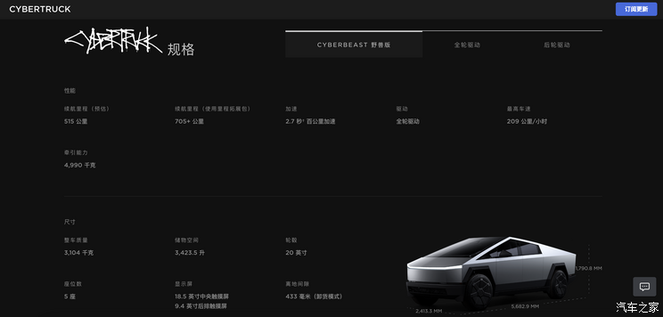 值得一提的是,此前从特斯拉中国官网来看,赛博越野旅行车将会有Cyberbeast野兽版、全轮驱动版、后轮驱动版,其中赛博越野旅行车后轮驱动版预计在2025年在中国上市。另外,此前马斯克在社交媒体表示,Cybertruck(赛博越野旅行车)在中国上路合法化会非常困难,但特斯拉会运送原型车来作为展示。