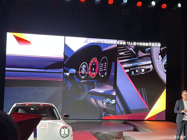 走进车内,整体氛围更加彰显了科技感,全新的12.6英寸全液晶仪表盘,取代了机械指针式仪表盘。同时,三辐式多功能方向盘右侧新增了红色功能按钮,并集成了驾驶模式选择旋钮功能;与此同时,新车的启动按键也变为按键式而非老款车型的旋钮式。中控台最醒目的是10.9英寸的内嵌式多媒体触控屏,下方保留有物理按键。另外新车的全液晶显示屏提供多达七种视图功能,其中包括灵感源自带中央转速表的保时捷经典五连表视图。